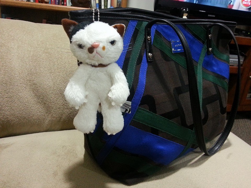 I searched through the different cats and found the perfect kitteh for me.  She’s angsty, pissy n just has lots of attitude.  But she did not want to be adopted, no, she was content to hang there with her cat friends and snark at people passing by in their ridiculous clothing and odd hair.  She took one look at me and sneered.  I said, I must have you, you understand don’t you?  Come with me.  She hissed and clawed, scratched and gave me the one eyebrow.  Too late kitteh, you are mine now and you are officially attached to my bag.   Better enjoy it.