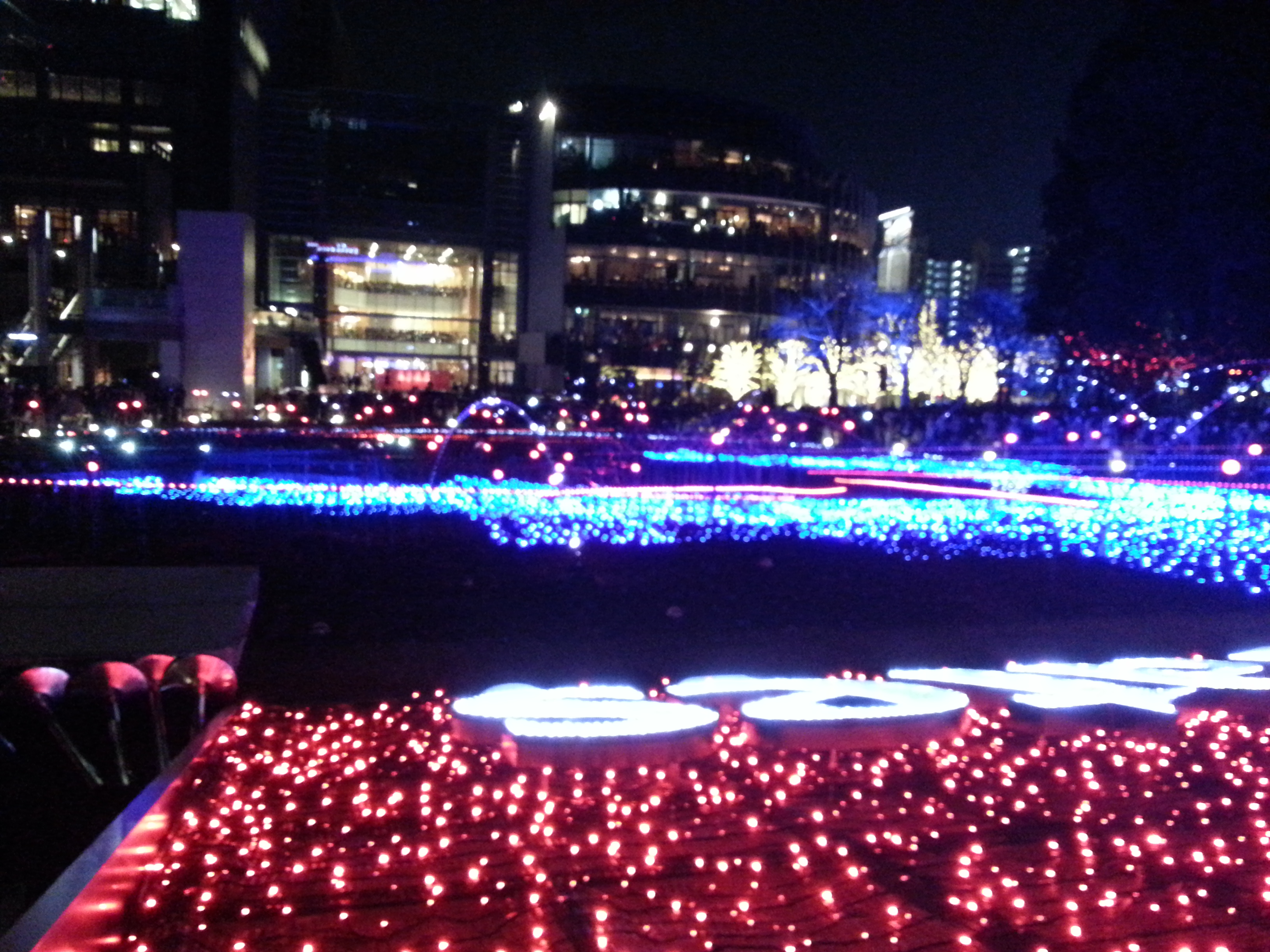 Tokyo Midtown is a plaza with shopping, art, restaurants and a large outdoor patio area that they had rigged up with lights to create an amazing scene.  When we stepped out of the train station we saw an Italian restaurant and decided to go in for an early dinner and some wine to get us ready for the crowd we were about to encounter.  After, killing a bottle of wine we ventured out to find this plaza which was only a few blocks away.  We found it and the line for the light show was realllllllly long.  We jumped in line and found it moved fairly quickly, but we had to get a little defensive for our spot in the line, this couple of older Japanese ladies were trying to nudge ahead of us.  We allowed them forward but it was a struggle to keep the rest at bay behind us.  The line moved along around the bend, down the steps, through the plaza, up the steps and out the other side, around the bend, down the lane which was lit up with some festive tree decorating and such.  Finally, we got to the illumination area and were not disappointed.  It was great, the crowd moved enough that everyone got a decent look at it from different angles.  First it was blue, then some designs with white and red, it was really a great show.