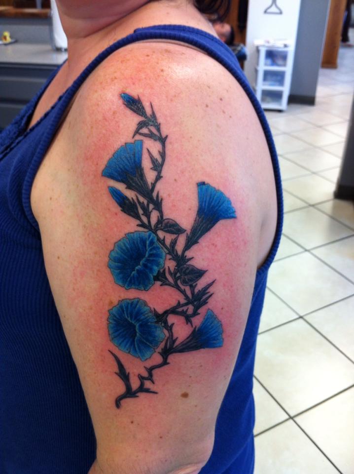The fourth I had done the day before moving out after breaking up with my long time boyfriend.  We went together and the blue in it is from the same ink well as the one used for his tattoo being done at the same time. (two different artists of course, hah).  We got back together about a year later and are happily married now.’