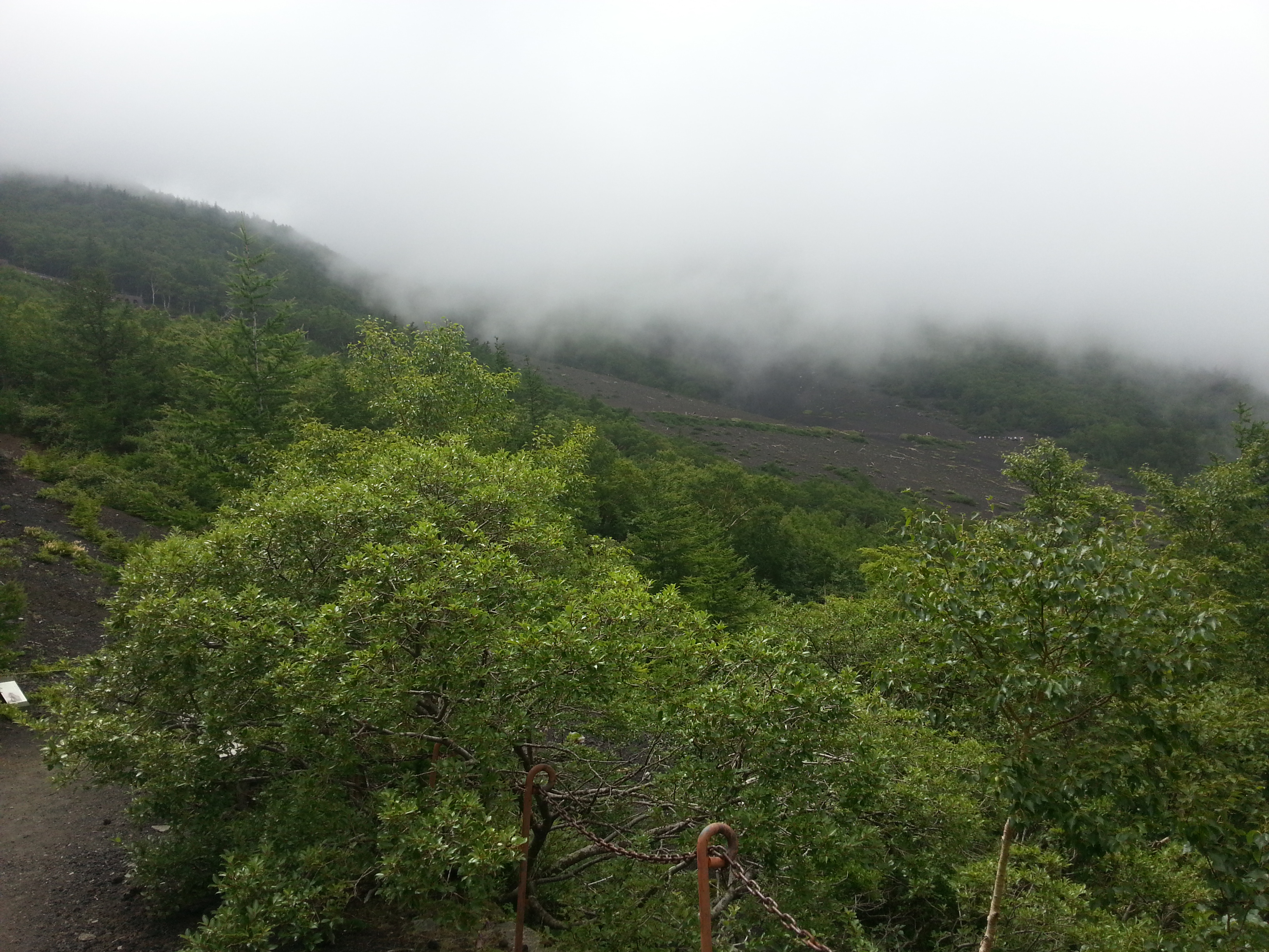 1. On the path I was on it was mostly volcanic rock pebbles in the open areas which are large slopes with no trees and wooded areas with larger rocks. A mix of trees, bushes, flowers (like those in the photo above) and large slopes of volcanic rock and flowers. I’m told it changes a bit as you go up, but I can’t testify to that. The entire hike takes a healthy, strong body about 6 hours I believe. I think Cale said the trees are only around the bottom (5th/6th stations), the rest of the hike is open and steep.